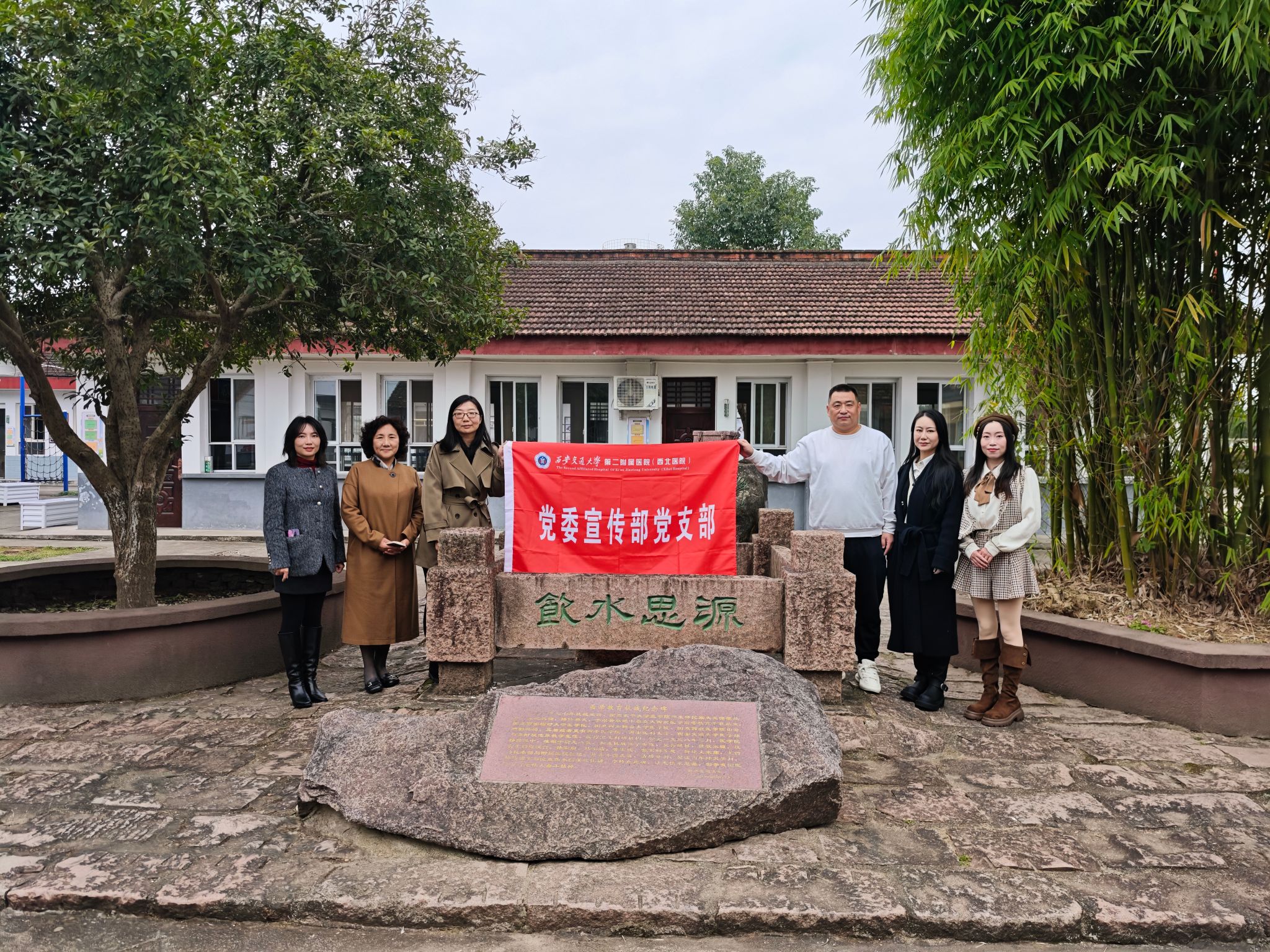 支部先前往汉中红色文化体验馆进行参观学习。在沉浸式的展陈环境中,党员们通过珍贵的革命历史文物、影像资料和高科技互动体验,系统了解了汉中地区光荣的革命传统与英雄事迹。为进一步强化理想信念教育,在文家庙小学内,支部党员们怀着崇敬的心情,在历史陈列室内,支部老一代党员买秋霞现场为大家详细讲解了每个照片背后的故事,通过现场讲解与瞻仰,那段艰苦卓绝又光辉伟大的办学历史变得清晰而具体,深深触动了每一位党员。随后,支部党员瞻仰了标志着西安交大“饮水思源”精神的纪念碑。大家肃立于“医学抗战纪念碑”前,深切缅怀在烽火连天的岁月里,老一辈医学教育家和医务工作者为保存医学火种、服务抗战大局所展现出的坚韧不拔与无私奉献。