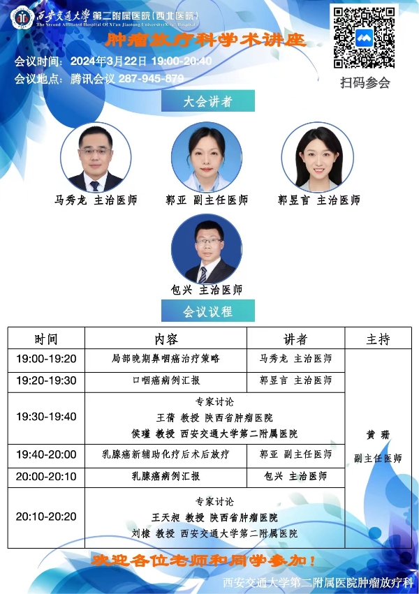 2024年3月22日下午,肿瘤放疗科开展了线上学术讲座。黄珊副主任医师主持召开会议。肿瘤放疗科主任马红兵对于来自陕西省肿瘤病院的王蒨教授、王天昶教授、我院侯瑾教授、刘棣教授以及所有与会人员表示了热烈欢迎。
