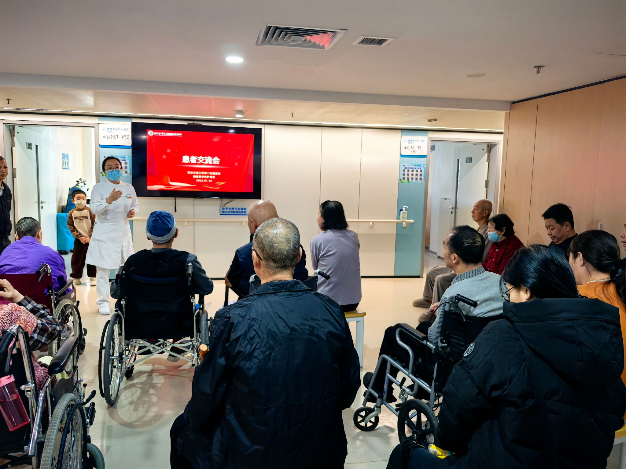“五星红旗迎风飘扬,胜利歌声多么响亮......”2026年1月10日下午四点西安交通大学第二附属医院的康复医学科传来了阵阵歌声。原来是康复医学科每月一次的患者交流会,康复科护士田鲜花和訾程程在护士长杨峰的安排下组织患者进行科普宣教和人文关怀。