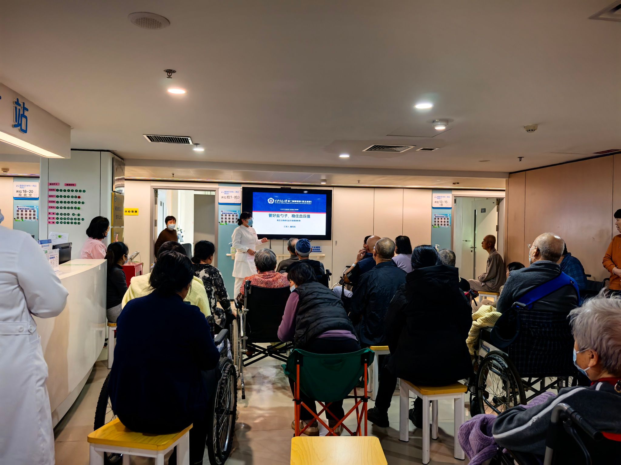 人文关怀不是说说而已,这样的活动在康复科自建科到现在每月都在进行,根据患者需要进行每月科普,比如良肢位摆放,鼻饲饮食注意事项,糖尿病饮食管理,压疮预防等等,这次患教会的主要内容是訾程程主管护士带来的“管住盐勺子,稳住血压值”,讲课结束的互动环节,患者家属踊跃发言,现场气氛非常轻松。最后在热情激扬的红歌声中,所有人回味无穷的结束了这次活动。