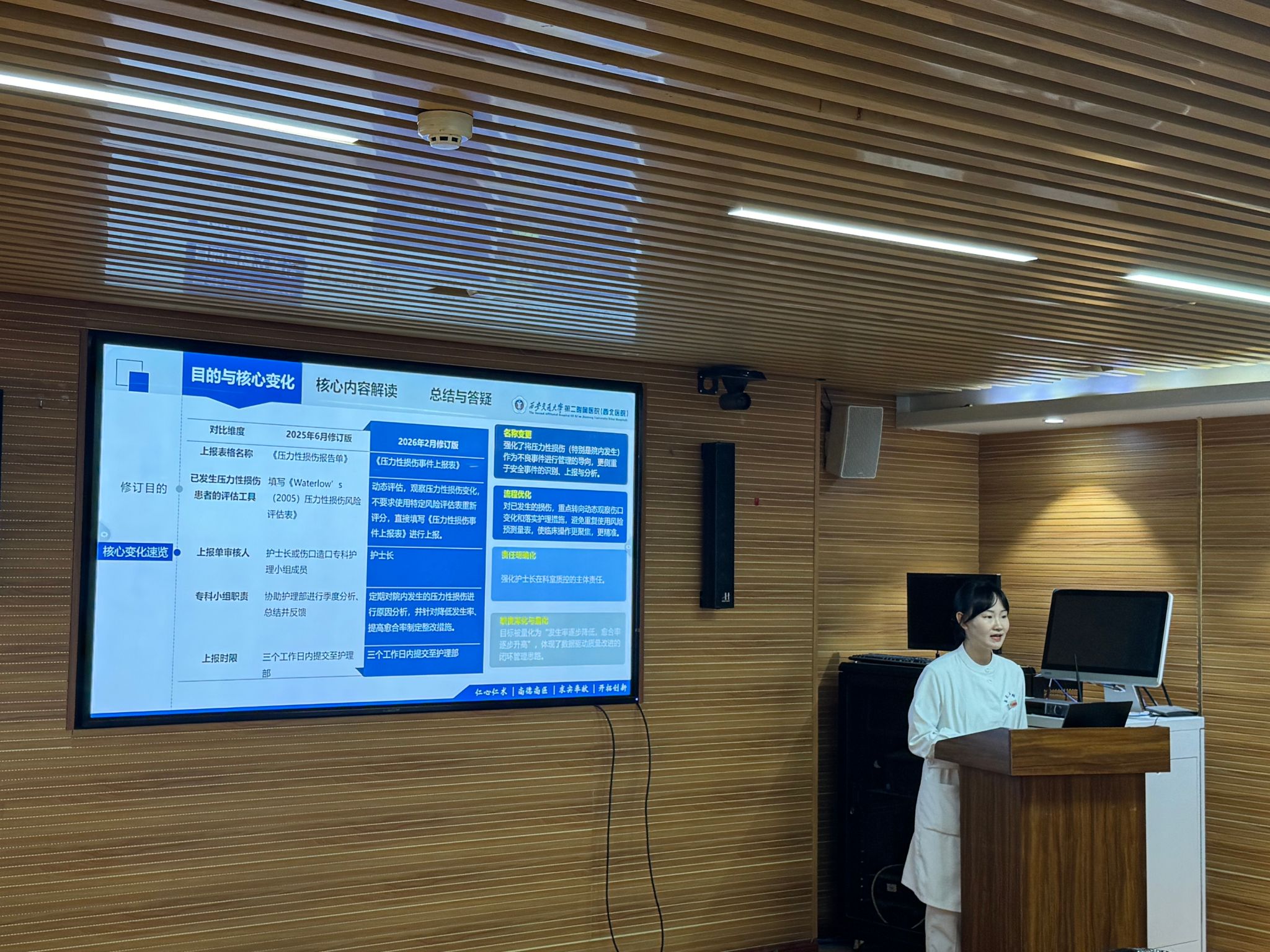 随后,刘颖主管护师对《压力性损伤管理制度-2026.2》进行简要解读并收集临床问题反馈。重点讲解了制度修订的核心变化,包括将院内压力性损伤纳入护理不良事件管理、取消已损伤患者重复风险评分、按人群适配Braden、Braden-QD、Waterlow’s等评估工具、明确上报流程及时限等内容,同时针对临床应用中的疑问进行现场解答,推动制度更贴合临床实操落地。