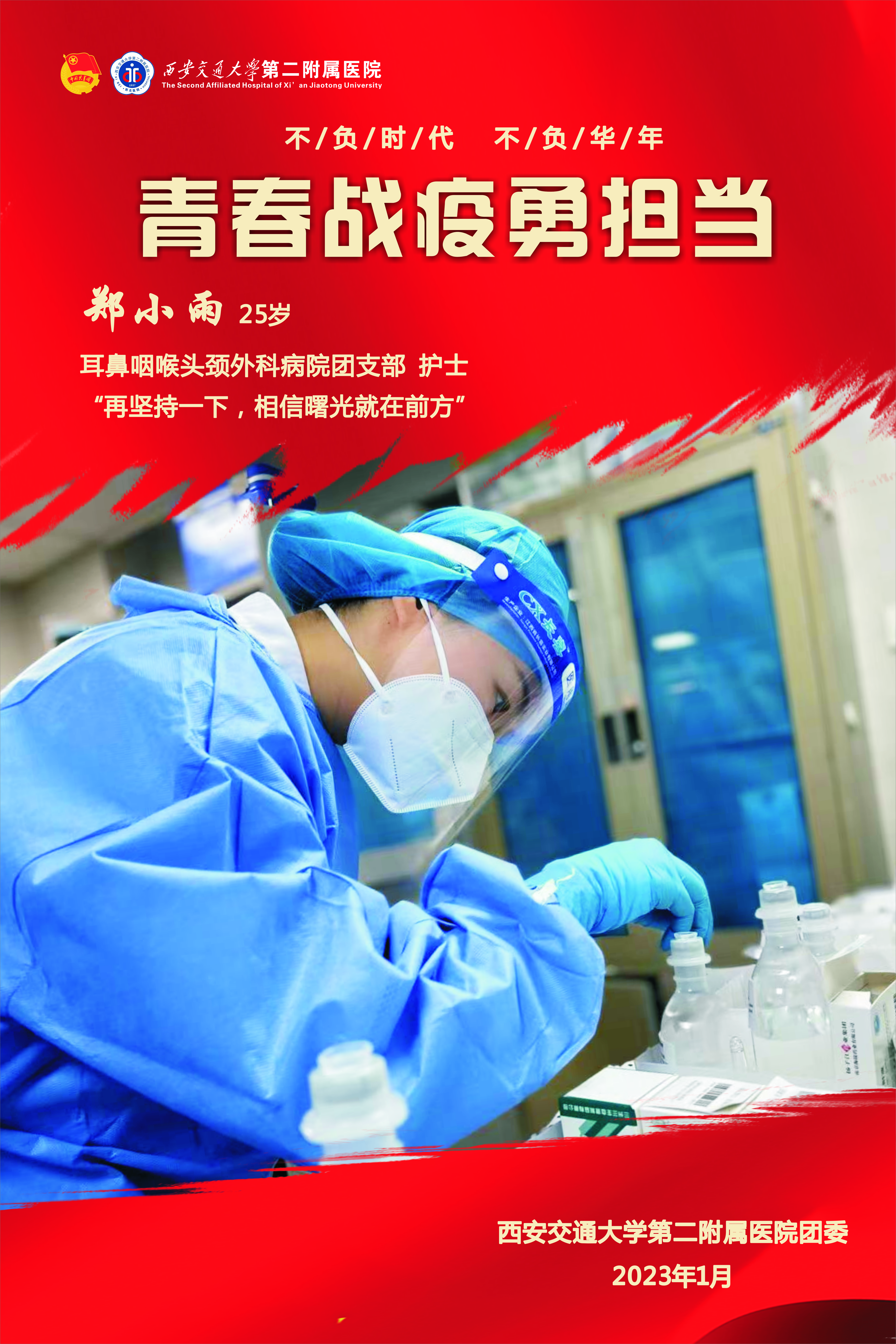 二院青年一代在抗疫防疫工作中始终都是勇于担当、敢于奉献的白衣战士,在当前守护人民生命健康、决战疫情的关键时刻,全院广大团员青年,紧急行动,尽锐出战、持续奋战,全力投身到疫情防控工作中,在本职岗位上充分尽显出“生命至上,举国同心,舍生忘死,尊重科学,命运与共”的抗疫精神,以奋斗姿态激扬青春,不负时代,不负华年!院团委将陆续推出“青春战疫勇担当”系列海报,展现二院青年战疫风采。