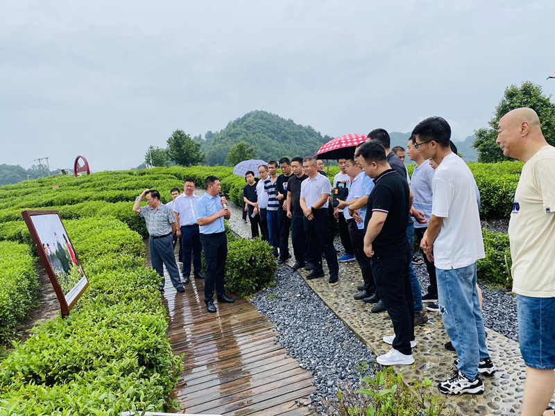 座谈结束后,一行人随即前往老县镇蒋家坪女娲凤凰茶叶现代示范园区开展“牢记嘱托,砥砺奋进”主题党日活动,现场听取蒋家坪村主任对习总书记2020年考察时的情景介绍:2020年习近平总书记考察时也是细雨蒙蒙,总书记称赞这里“空气好、环境好、生态好”,当总书记听到当地村民因茶致富的消息时高兴地说:“人不负青山,青山定不负人”。沉浸在美好的氛围中的党员同志们更加深切体会到“绿水青山就是金山银山”的深刻内涵。