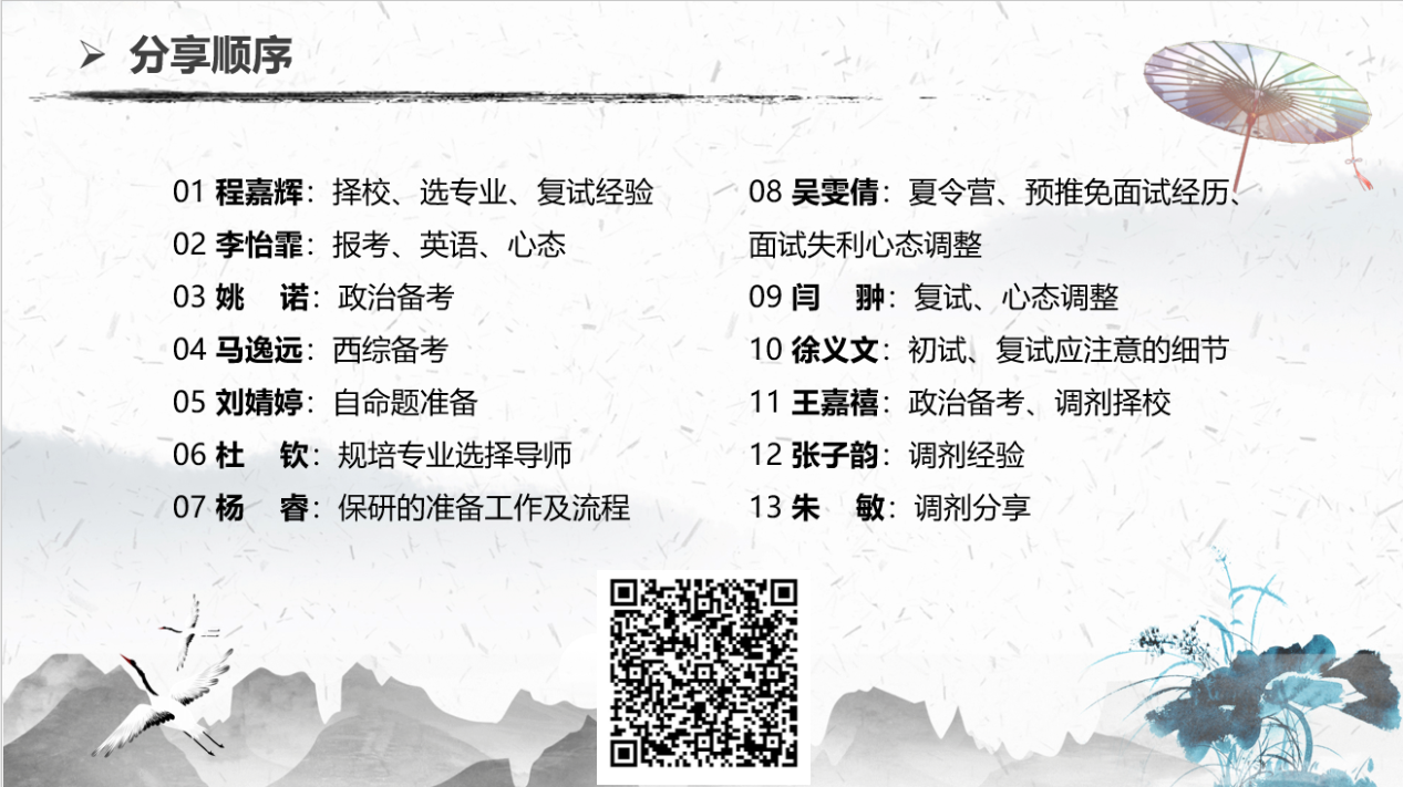 刘婧婷学姐是本次分享会唯一一位考自命题的分享人,特殊的经历让她对考研有着不一样的体会。她介绍了“南学北专”的地域特点,报考自命题院校需要做哪些准备,开拓了同学们的视野,为有同样想法的同学增添勇气。