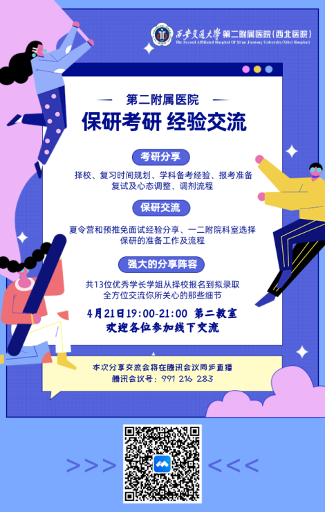 一年一度的毕业季又来了。看着即将毕业的校友们将会奔赴五湖四海继续创造自己的未来。你除了祝福和羡慕,是否也有过些许迷茫?为了帮助同学们及时了解保研考研相关事宜,4月21日晚19:00,二附院学工部“医路行”就业工作室联合本科生第二党支部,于第二教室(线下)和腾讯会议(线上)顺利举办“保研考研经验分享会”活动,会议邀请17级上岸名校的学长姐主讲,按照择校经验、学科备考、保研心得、复试调剂经验的顺序,13位优秀的学长姐分享自己的经历,为学弟学妹们的求学之路夯实根基,排坑避雷。每位分享人完成分享后,都安排有答疑环节,做到有针对性地解答,为迷茫的同学们指引方向。