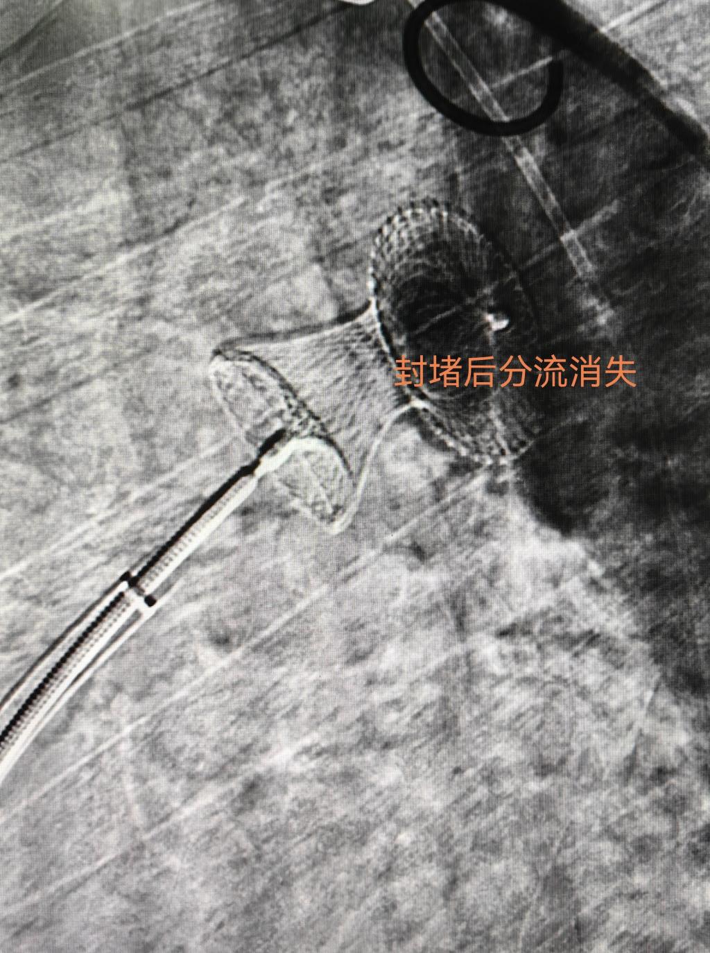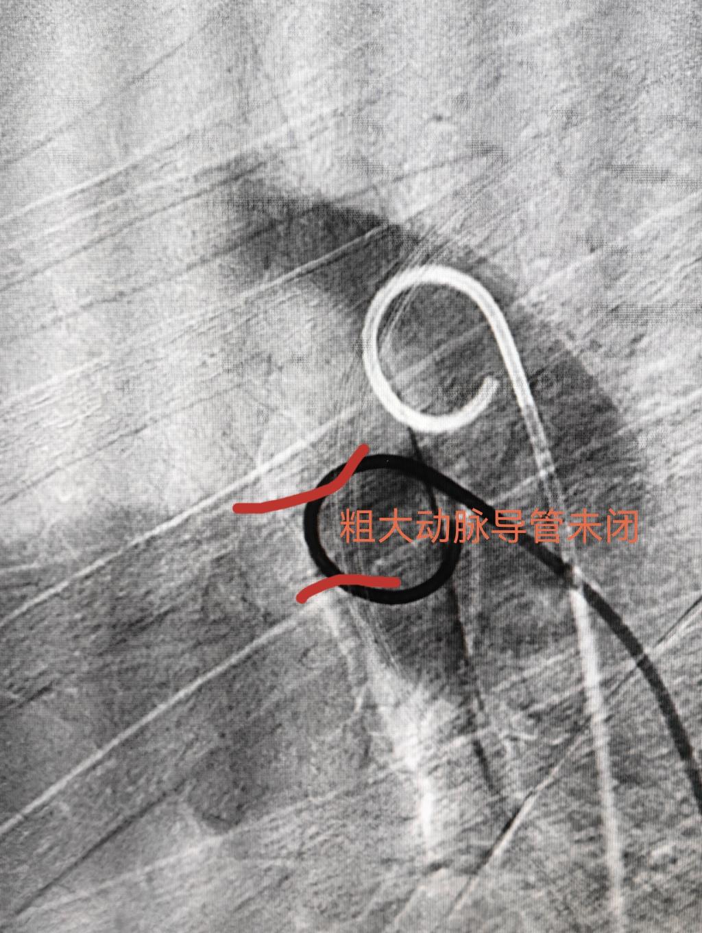 入院后第五天,完成充分的术前准备后,由相里伟医生主刀,张忆雯医生和董泽平医生协助,在导管室人员的配合下,按计划进行介入手术。血管穿刺,主动脉造影,肺动脉测压都顺利完成,也完全证实了术前影像学测量及病情判断。术中遇到的“拦路虎”是经肺动脉通过PDA困难,就改从主动脉侧超选择进入肺动脉,经股动脉送入圈套器去抓捕股静脉侧预置在腔静脉或肺动脉的导丝,期间经历了圈套器无法进入腔静脉和右心室敏感极易诱发阵发性室速等障碍,经过手术团队耐心的尝试,默契的配合和精巧的技术操作下成功建立了封堵器释放轨道。最关键的时刻到了,当封堵器沿着输送鞘缓慢送达降主动脉位置,依次释放主动脉侧封堵盘,封堵器腰部,肺动脉侧封堵盘,透视下腰征清晰,牵拉实验稳定,造影分流完全消失,听诊心前区杂音完全消失,动脉导管未闭介入封堵获得成功,意味着患者可以避免创伤大风险高的外科手术(图3、4、5)。更令人欣喜的是,当动脉导管未闭治愈的同时,左右心房间的卵圆孔未闭分流也瞬间消失了,甚至导丝尝试通过也变得很困难,再去处理卵圆孔未闭也已经失去必要性了,单纯动脉导管未闭封堵手术达到了“一石二鸟”良好疗效。