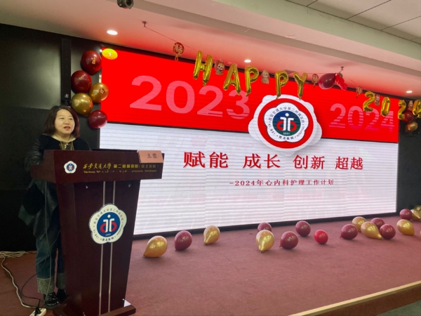 最后,王蓉护士长对2023年心血管内科护理特色亮点工作进行了梳理。她肯定了心内护理团队在2023年所取得的成绩,奋斗中送走岁月,实干中铸就辉煌,心内科护理团队所取得的成绩是大家齐心聚力,踏实肯干的结果。她以“赋能 成长 创新 超越”为主题对2024年护理工作进行了筹划,强调2024年心血管内科护理团队应围绕工作重点、目标及任务展开,希望科室护理工作在新的一年,持续创新,不忘初心,再接再厉,勇攀高峰。