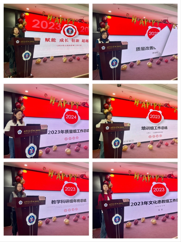 首先科室六名副护士长对2023年各自分管的护理工作进行总结汇报。王妮副护士长就分管的培训谈到,培训是一切工作的基石,只有扎实的理论与操作技能才是保障一切护理工作的基础;曹春晖副护士长就分管的国有资产、医用耗材等方面进行了详细的阐述,开源节流,人人都要守护好科室的资产;宋雅璠副护士长就护理质量存在的问题做了说明,她特别强调,强内涵、抓细节、保安全,深耕专业,聚焦质量,百忙千忙,忽视质量是瞎忙,千苦万苦,不抓质量会更苦,质量放松,劳而无功;宁珊珊副护士长就自己分管的人力资源管理、护士分层及岗位管理、绩效管理等工作做了分析,人是一个科室发展的根本力量,人员的管理是一门艺术,人员管理好了,对科室的发展会起到事半功倍的作用;雷蕾副护士长就分管的科普、患教、宣传等方面的工作做了汇报,提高患者及家属的受教水平任重而道远,科室的宣传要做到更上一层楼,需要大家齐心协力。刘欣源副护士长就教学、科研等工作进行了总结与展望,学生是新生力量,是我们的接班人,要爱护学生,倾尽所能培养学生,科研工作大家要攻坚克难,有所成就。