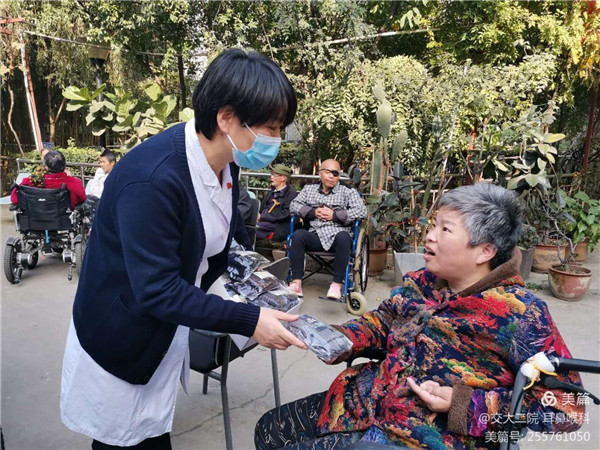 一场秋雨一场寒,随着天气渐渐变冷,老人们外出活动手部易受风寒,杨慧护士长代表病院党支部为每位老人都赠送了一双羊毛手套,希望老人们在寒冷的冬天也能感受温暖,在场的人深受感动,幸福都写在每个人脸上。老人们聊起武汉新冠肺炎疫情,感叹我们国家在习近平总书记的领导下疫情得到有效防控。了解到杨慧护士长在武汉疫情暴发第一时间前往支援,老人们很是激动,拉着杨慧护士长的手像个小孩一样骄傲自豪地说到:“我和英雄握手啦!”