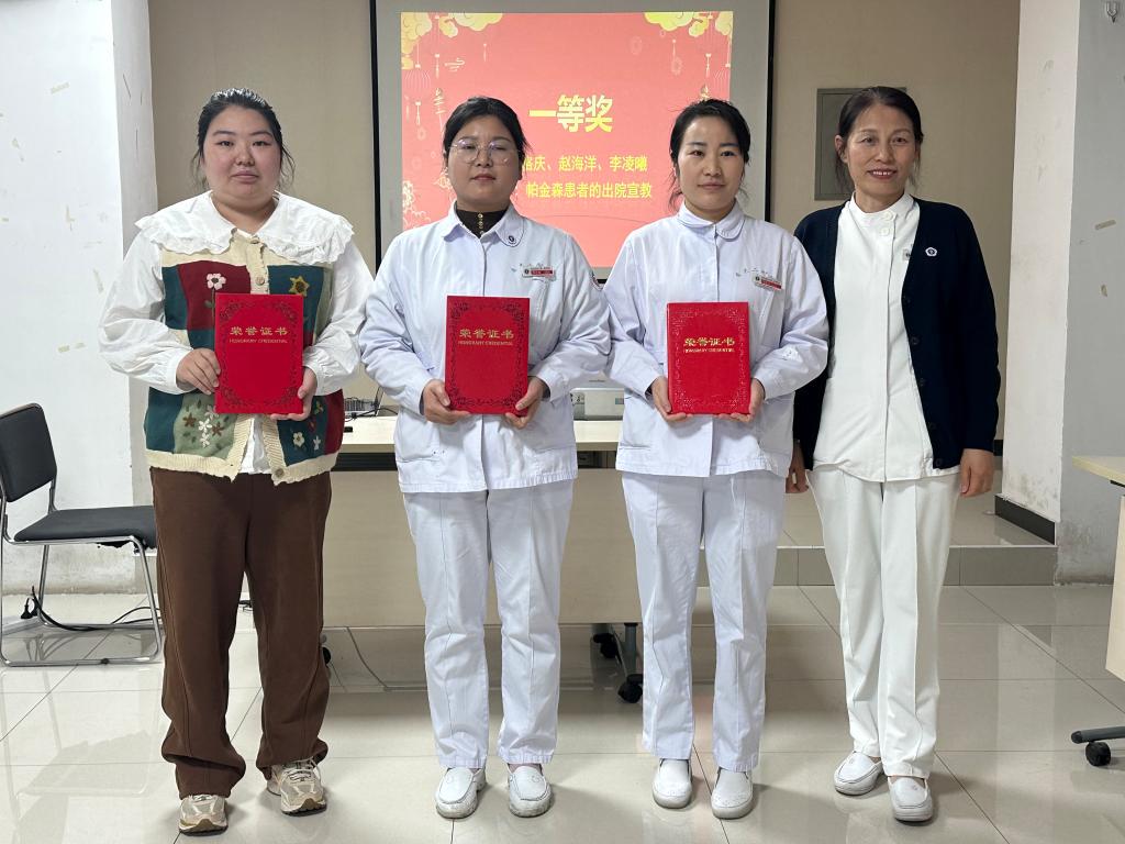 最后统分,获得一等奖的作品是张欢瑞、程格庆、赵海洋、李凌曦表演的帕金森患者出院宣教。获得二等奖的作品是郭磊、邓荣荣、屈佩表演的误吸患者健康宣教,和韩艳等表演的皮下注射低分子肝素的健康教育。获得第三名的是连柳霞、李珂、权钰杰表演的PICC患者健康宣教;党阳、程霞、张庆爱表演的垂体瘤患者围手术健康宣教;卢瑜、吕晓婉表演的入院患者健康宣教。评委老师对获奖选手颁发了荣誉证书。