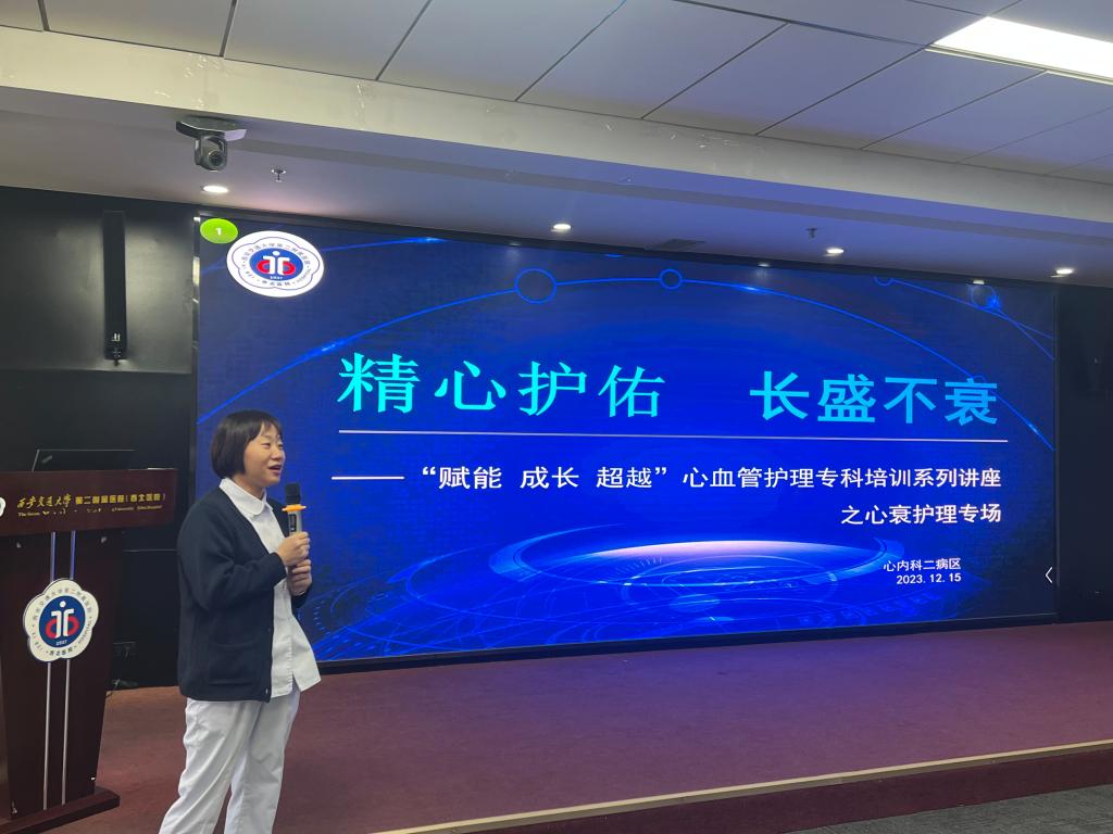 2023年12月15日下午,心血管内科于大明宫院区14楼会议室举办“赋能成长超越”心血管护理专科培训系列讲座之心衰护理专场。本次讲座由心血管内科护士长王蓉担任主席,副护士长王妮主持。魏瑾主任医师、王妮副主任护师、殷美静主管护师、冀春娟主管护师受邀在会议上进行授课。心血管内科全体护理人员参与本次培训讲座。