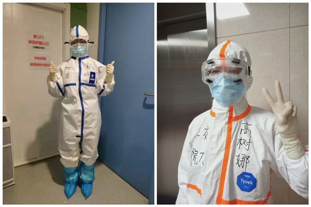 这一天,我们迎来了首次6人小聚餐,可是也只能端着各自的盒饭相隔2米远。领导通知符翠老师所在的护理组延迟去病区,史海涛老师就成了我们中第一个出征人员。大家都十分紧张,他是下午三点的去病房接班,我们所有人上午已经聚集在史海涛老师房间门口,叮嘱他各种注意事项,希望第一天的工作一切顺利。史海涛老师却很淡定,练了两次穿脱防护服,但是两次帽子都会沾到自己的衣服,大家正在为这件事焦虑的时候,马师洋老师带来了新的消息,医院的流程是将隔离衣穿到防护服里边的,大家可以放心,不用担心脱防护衣的时候帽子会碰到衣服背面。我们反复帮史海涛老师检查用物是否准备齐全,叮嘱他穿脱防护服的注意事项、如何妥善固定眼镜、如何防止护目镜起雾,大家生怕他漏掉什么。下午2点30分我们下楼为史海涛老师举行了小型的欢送仪式,大家决定在第一次出征前互相送行,合影加油,让彼此能少些焦虑,踏实工作,做好防护。由于医疗物资有限,史海涛老师的第一个班并没有在病房工作,是在清洁区办公室熟悉系统和患者病情,我们接管的病区共有45个患者,8个病危患者。