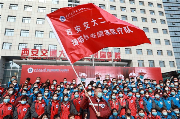 2月8日元宵佳节,神经内科刘璟洁、刘媛媛、郑佳和郭学军在内的西安交大二附院130名医护人员在党委书记巩守平和护理部主任杨惠云(陕西省首位南丁格尔奖获得者)带领下飞往武汉。临行前,交大校长王树国授旗并发表讲话,几度哽咽,洒泪送别。王校长称130名医护人员是当之无愧的英雄,是所有交大人的自豪。他坚信在党中央的坚强领导下,这次防疫控疫战争一定能打赢。王校长一并带来张迈曾书记的叮嘱,让大家一定要注意自身安全。他们希望大家记住这个难忘的日子,记住这次难忘的出征,期待大家安全健康凯旋,共庆抗疫胜利!
