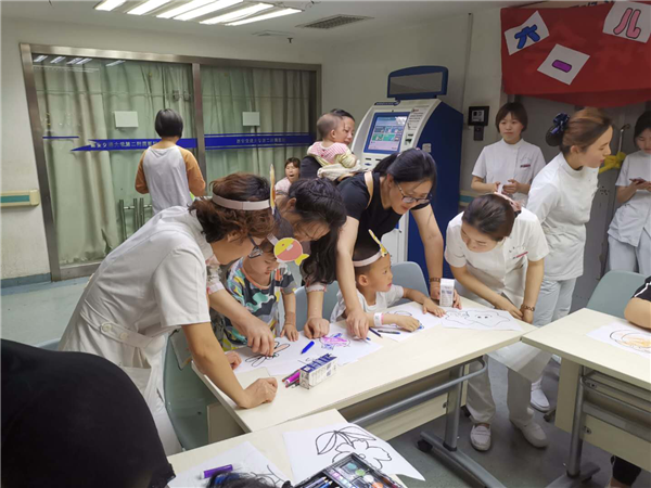 5月31日下午,小儿外科的医护人员利用休息时间,为病房里的小患者们送节日问候,活动在综合大楼12楼大厅举办。