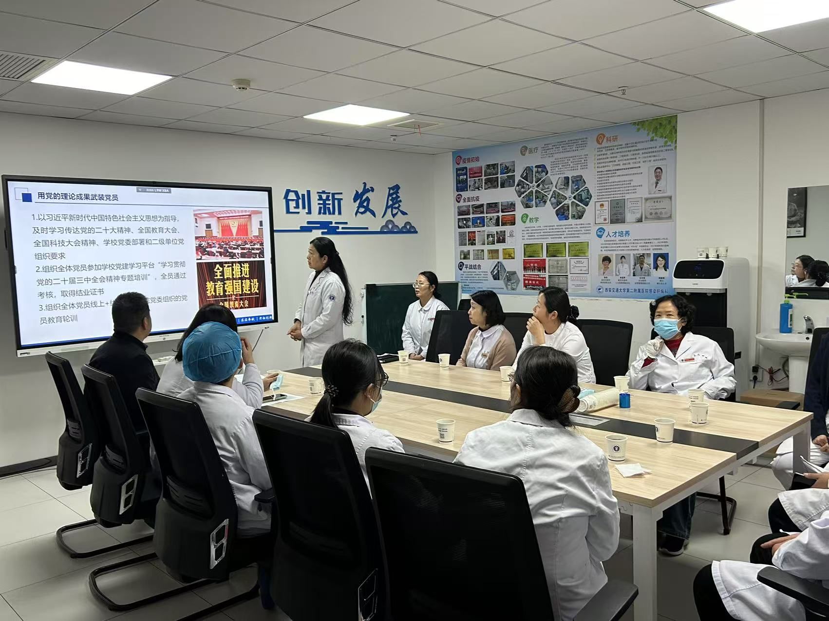 首先支部展淑琴书记代表支委会向全体党员汇报了党支部一年来的工作情况。她从党建工作、党员教育管理、组织活动开展以及党支部在科室工作中的引领作用等方面进行了详细阐述。过去一年,神经内科党支部积极组织党员参加各类政治学习活动,深入学习习近平新时代中国特色社会主义思想,不断提高党员的政治觉悟和理论水平;在党员教育管理方面,严格落实“三会一课”制度,定期开展主题党日活动,丰富党员教育内容;党支部还在科室的医疗、教学、科研等工作中发挥积极引领作用,带领全体医护人员提高医疗服务质量,积极参与人才培养和学科建设。