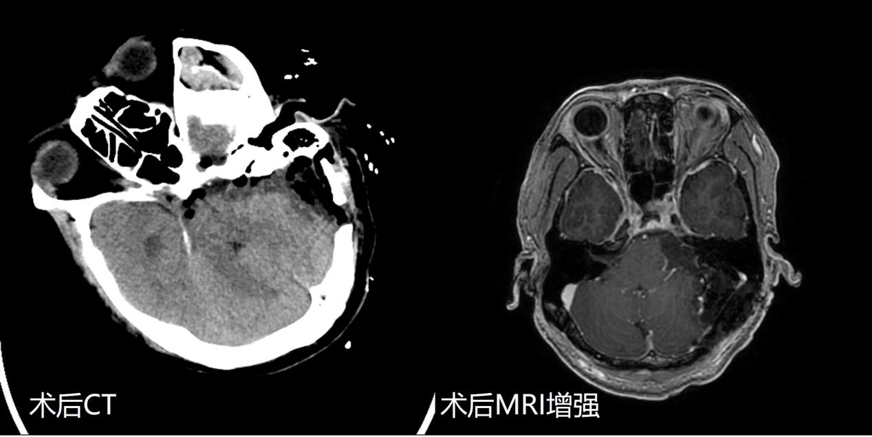 入院后,神经外科周乐教授、权俊杰副教授、马程文博士精心准备。在神经电生理监测技术辅助下,应用显微镜下神经束膜下分离技术,将肿瘤完全剥离切除,面听神经得到解剖保留。术后影像检查证实肿瘤完全切除。术后患者面部肌肉运动正常,同侧听力虽有下降,但仍有功能。目前患者已康复出院。