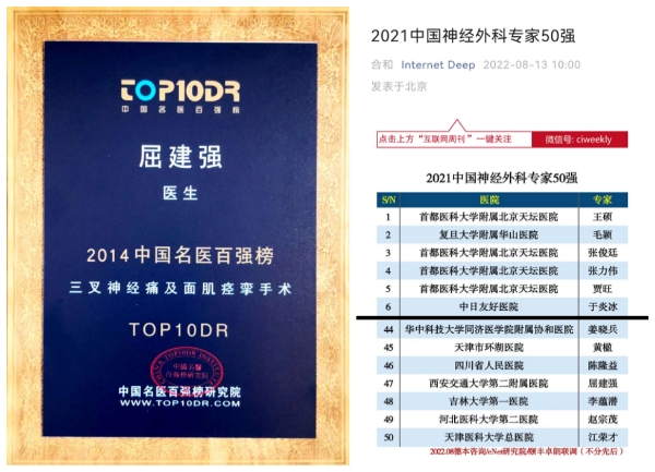 屈建强教授也凭借其在颅神经疾病外科治疗方面的影响力和创新性工作入围中国名医百强榜TOP10,并入选2021年度(2022年底评选)中国神经外科专家50强,参编国家“十四五”重点规划教材《功能神经外科》、人卫出版社《周围神经外科学》,先后参与编写了《中国显微血管减压术治疗面肌痉挛专家共识》、《中国显微血管减压术治疗脑神经疾患围手术期风险专家共识》、《中国显微血管减压术治疗脑神经疾患术中减压植入物专家共识》、《显微血管减压术围手术期电生理评估中国专家共识》《经皮球囊压迫术治疗三叉神经痛中国专家共识》等多部专家共识,为颅神经疾病在中国的规范化外科诊疗建言献策。