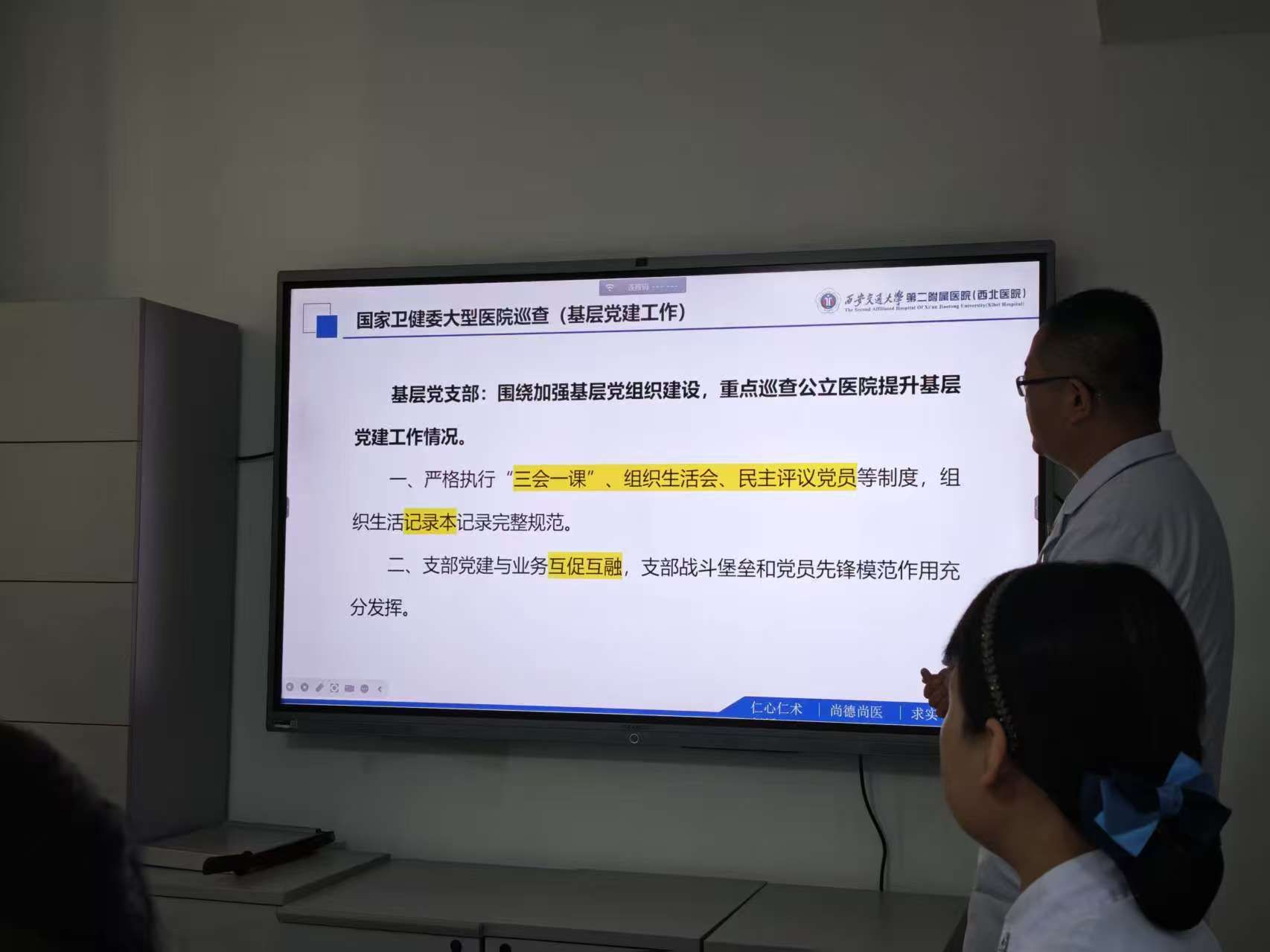 会议最后,许刚书记进行总结发言。他语重心长地指出,全体党员要时刻牢记“打铁必须自身硬”的要求,在日常工作和生活中严格自律。他着重强调,要围绕“学术接待、科研经费使用、医患沟通、行风建设”等关键领域,时刻保持高度警惕,严守纪律红线,杜绝任何形式的违规行为。他提出,要以此次“大型医院巡查”为契机,以“中央八项规定”为基本要求,充分发挥党建引领作用,推动学科建设高质量发展。全体党员要以患者为中心,努力提供优质、高效、贴心的医疗服务,不断提升患者的就医体验和满意度,为医院的长远发展和患者的健康福祉贡献全部力量。