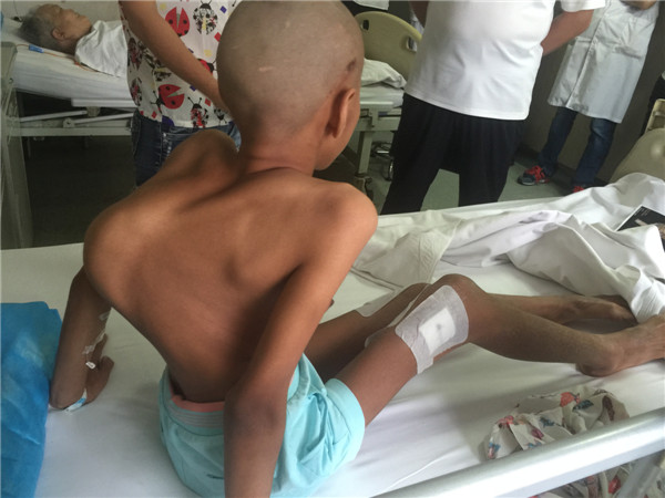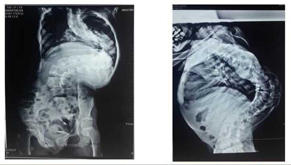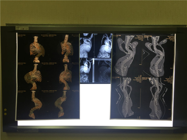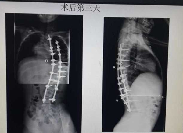 手术前,学科带头人贺西京教授、李浩鹏主任邀请有丰富麻醉经验的李有才教授,以及主管医生,根据患儿全身状况,进行细致的病例讨论,制定周密的手术方案。于8月18日,由贺西京、李浩鹏教授亲自主刀,主管医生张纯、杨宝辉、蔡璇等配合,李有才教授负责麻醉,对患儿实施全麻下全脊柱截骨矫形术,术中在严密保护脊髓的前提下,将脊椎一节节打断、截骨,再重新排列、固定。因脊柱畸形严重,常规固定方式无法完成,只能凭经验探索进行,多次进行术中透视。如此大范围脊柱矫形,风险极大,术中稍有不慎,无论是术中操作,还是骨片,都有可能损伤血管造成大出血,危及生命。在完成椎体截骨时,脊髓也要完成近120度的变位,此时极易损伤神经,风险极大。神经损伤会造成患儿终身瘫痪,双下肢丧失运动、感觉功能,并出现大小便失禁等,因此要求术者一定要心细,操作要轻、准。手术全程在诱发电位严密监测下进行,及时反复监测神经传导速度,判定神经功能。在手术、麻醉及护理人员的紧密配合下,经过近10小时紧张、细致的手术,手术取得成功,矫形由患儿颈后部到腰下段的脊柱全段,缝针36针,术中输血1800毫升,术中矫正脊柱畸形角度约120度。术后患儿即可平卧,背部大驼背畸形显著改善,双下肢感觉、运动良好,自解小便,目前正在积极康复中。