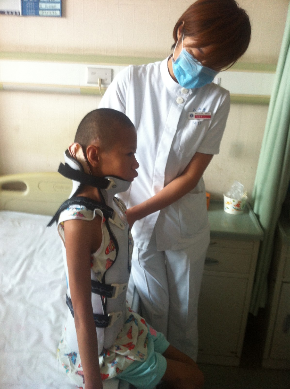 手术在8月18日如期进行,由贺西京、李浩鹏教授亲自主刀,李有才教授负责麻醉,采用全程诱发电位监护,施行全脊柱截骨矫形术。即将脊椎一节节打断、截骨,再重新排列、固定。经过近10小时紧张、细致的手术,患者安返病房。看到婷婷的那一刻,她轻轻拉住主管护士的手,这个细微的动作却表达出对我们的肯定。由于手术创伤大及各种引流管路,婷婷烦躁哭闹,总要翻来倒去,不配合治疗与护理。这可是脊柱手术,尤其是大范围脊柱矫形手术的大忌,护士一边要安慰她,还要保持脊柱的稳定,在病情允许的范围内尽量让她舒适些。脊柱的矫正,引起胸廓的改变,本身肺功能就差,加之手术时间长,术中出血多,患儿感觉心慌、气短,心率增快。我们及时发现,并告知主管医生,请心内科会诊。调整治疗方案,并急输红细胞悬液等,不适症状等到改善。为了便于术后护理,预防术后压疮等并发症,我们为婷婷使用了气垫床,希望她术后能舒适些,但孩子不适应,哭闹,不要气垫床。更换后,护士长要求加强了护理工作,每日多次到婷婷床前关心,询问患者病情。责任护士定时协助患者轴线翻身、按摩受压部位。做到班班交接,并做好术后功能锻炼,避免了并发症的发生。