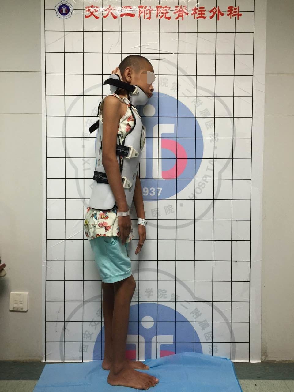 13岁的小婷婷,重度脊柱侧弯畸形,脊柱向外成角160度、胸廓畸形、心肺功能差,辗转全国多家三甲医院就医,均被告知风险及难度极大,放弃治疗。今年7月,患儿及家属慕名来到我科就诊。经贺西京院长、李浩鹏主任及治疗小组商定,因其脊柱畸形较重,椎旁肌肉僵硬,不能急于手术治疗,应分二步走,先牵引,改善胸廓畸形及椎旁肌肉僵硬等状况,以适应手术时的牵拉,再行全脊柱截骨矫形手术。