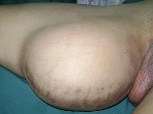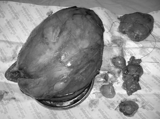 日前骨三科收住一名63岁男性农民患者。病人于15年前发现右大腿包块,在当地医院行切除术,15年来肿块再次复发,逐渐增大至西瓜大小,严重影响行走以及穿衣。由于病人来自农村,经济状况较差,所以延误治疗。入住我院骨三科后,经查体发现病人大腿内侧可见15×20cm包块,质软,边界清楚,活动度欠佳,未闻及血管杂音,右下肢感觉血运正常。经B超检查提示为巨大肿瘤,来源于肌层肿瘤可能;行磁共振成像检查后提示横纹肌肉瘤可能。入院后考虑患者术后15年肿瘤复发,携带巨大肿瘤进行日常生活相当艰难,只有进行切除才能解除病人痛苦。科室高度重视,兰宾尚主任亲自协调,组织全科讨论,制定了详细的诊疗方案。于12月19日由闫宏伟副教授主刀、在宋焕瑾主治医师及薛建利医师的协助下,行肿瘤探查切除术。考虑患者曾有手术切除病史,病变区解剖关系复杂,术中从肿瘤包膜外仔细分离结扎肿瘤表面曲张的血管,尽可能地保护血管神经,切除巨大肿瘤,扫除周围肿大的淋巴结,肿瘤终于被清除干净。经测量,肿瘤约25×16×12cm大小,重达约八斤,大家为该患者携带如此重的肿瘤进行日常生活和农间劳作5年之久而吃惊,也为我们能彻底解除患者之病痛,尽一点医务人员微薄之力感到欣慰。术后病检提示血管脂肪瘤。该患者在科室医护人员的精心护理下,目前已痊愈出院。(骨三科宋焕瑾)