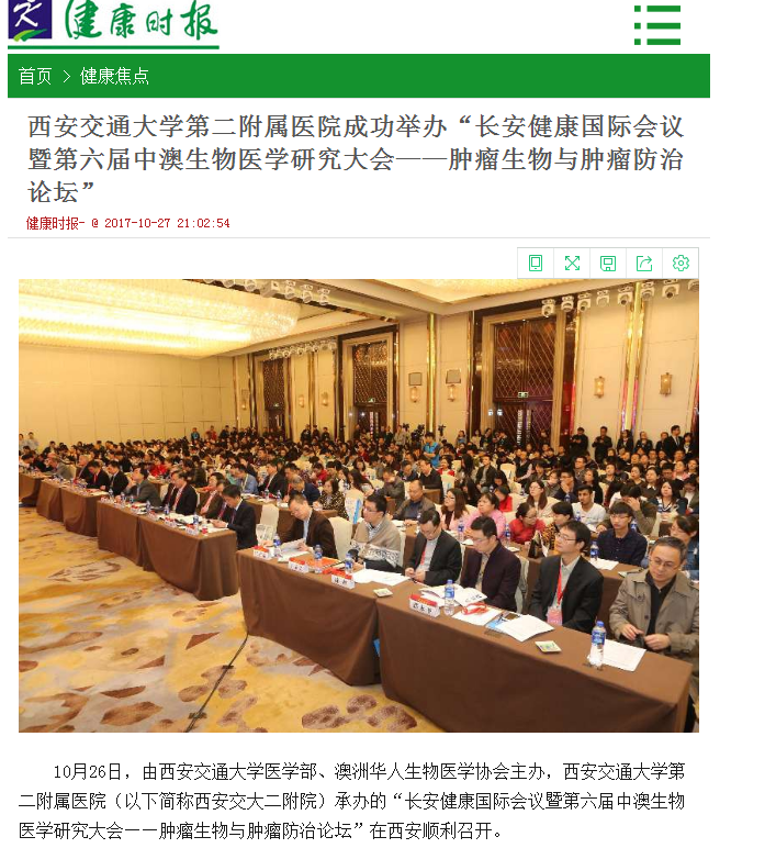 2017年10月27日 《健康时报》:西安交通大学第二附属医院成功举办“长安健康国际会议暨第六届中澳生物医学研究大会——肿瘤生物与肿瘤防治论坛”