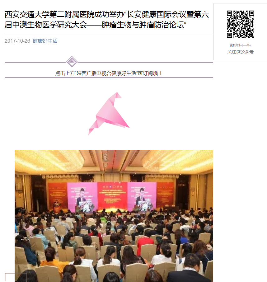 2017年10月26日 健康好生活:西安交通大学第二附属医院成功举办“长安健康国际会议暨第六届中澳生物医学研究大会——肿瘤生物与肿瘤防治论坛”