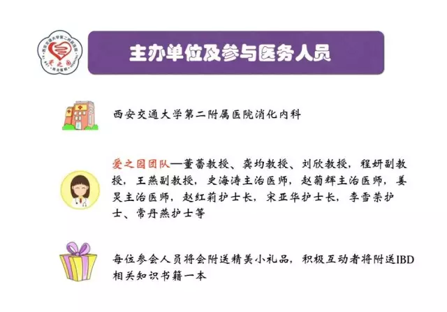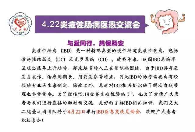 为了方便广大炎症性肠病患者与专家进行直接的面对面交流,更好的了解IBD相关知识。西安交通大学第二附属医院消化内科IBD爱之园团队将于4月22日举行IBD医患交流会及义诊活动,欢迎广大患者前来参加。