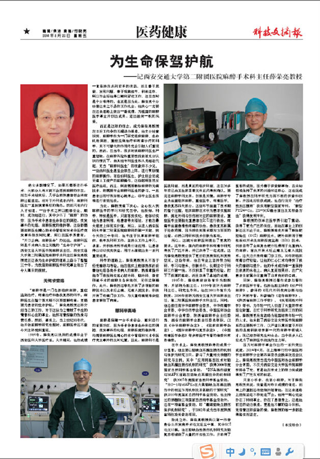 2014年8月22日,科技文摘报医药健康20版刊登采访我院麻醉手术科薛荣亮教授的相关报道,题为:《为生命保驾护航——记西安交通大学第二附属医院麻醉手术科主任薛荣亮教授》。全文如下: