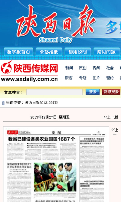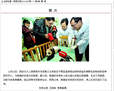 2013年12月27日,陕西日报4版《图片新闻》刊登我院皮肤病院专家为大熊猫安安诊治的报道。