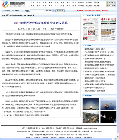 2012年5月8日,阳泉新闻网健康频道刊登我院承办国际神经修复学会第五届年会的相关报道,题为:《2012年世界神经修复年度盛会在西安落幕》