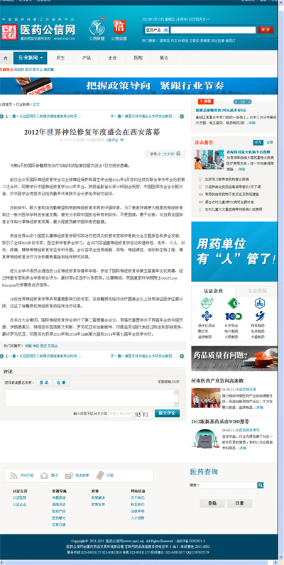2012年5月8日,医药公信网行业新闻频道刊登我院承办国际神经修复学会第五届年会的相关报道,题为:《2012年世界神经修复年度盛会在西安落幕》
