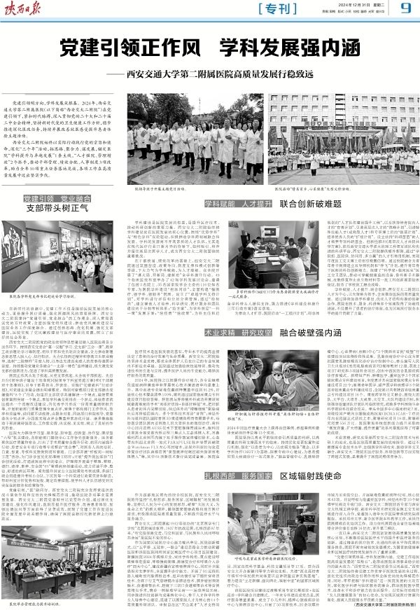 党建引领明方向,学科发展筑根基。2024年,西安交通大学第二附属医院(以下简称“西安交大二附院”)在党建引领下,紧扣时代脉搏,深入贯彻党的二十大和二十届三中全会精神,坚持新时代党的卫生健康工作方针,稳步推进深化医改任务,持续开展改善就医感受提升患者体验主题活动。