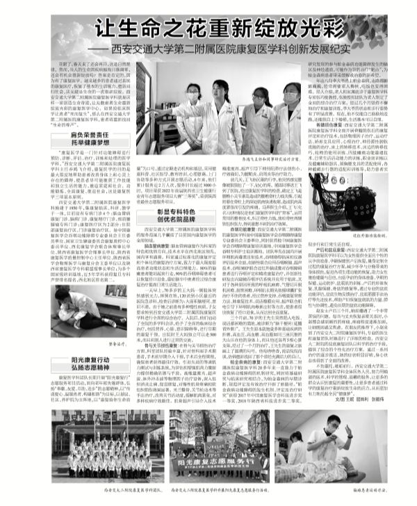 花谢了,春天来了还会再开,这是自然规律。然而,当人的生命因疾病摧残日渐凋零,还会有机会重新绽放吗?答案是肯定的,因为有了康复医学。越来越多的患者通过系统的康复医疗,恢复了基本的生活能力,重新回归社会,这无疑是生命的一次重新绽放。西安交通大学第二附属医院康复医学科就是这样一家创造生命奇迹,让无数患者生命重新绽放光彩的康复医学中心。如果说临床医学让患者“死而复生”,那么在西安交通大学第二附属医院康复医学科,患者将重新找回“生命的尊严”。