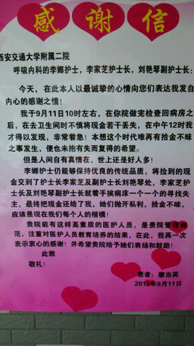 9月11日上午,呼吸内科病区像往常一样忙碌而有序的工作着。10时左右,李娜护士在病区卫生间地面无意中发现现金一沓,她捡起后经清点为1600元,当时的她毫不犹豫将捡到的现金如数交到病区护士长李家芝老师和刘艳琴老师处,两位老师经过商量决定先去病房询问看是否是病区住院患者所丢钱物。当询问到12号病房时,85床患者廖当英阿姨诉自己确实于当日丢失1600元钱,经详细询问时间、地点、钱数吻合,两位护士长立即叫来李娜护士一同将现金如数归还患者,患者非常感动。一再感谢说“交大二院呼吸内科不但护理技术好,而且护士职业素养如此高”!看着眼前失而复得的现金,患者连连表示非常意外。经过沟通我们了解到,该患者来自农村,1600元是准备的住院费,因为放在衣服内侧口袋,去卫生间时不慎丢失。患者家属在感动之余特写感谢信一封以表达对李娜护士及医院的真挚谢意。
