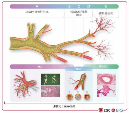 上图:(A) 近端肺动脉纤维性阻塞(血管直径10-40 mm);(B) 远端节段性和亚节段性肺动脉纤维性阻塞,可能适用PEA和BPA干预(血管直径210 mm);(C) 远端亚段肺动脉纤维性阻塞,在肺动脉亚段分支中形成网状病变,适合BPA干预(血管直径0.55 mm);(D) 远端亚段肺动脉纤维化阻塞,形成网状病变,可能伴有微血管病变(血管直径<0.5 mm);(E)微血管病变(血管直径<0.05 mm)通过药物治疗。