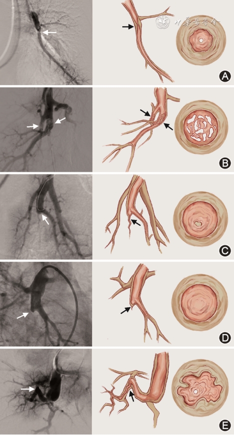 病变的血管造影分类:A为环状病变;B为网状病变;C为次全闭塞病变;D为完全闭塞病变;E为迂曲病变。