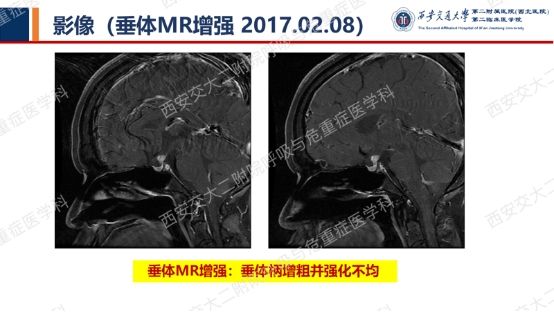 综合以上病史和资料,患者多尿多饮并干咳、胸闷、气短,反复气胸,尿比重低下,激素水平异常,胸部CT提示“肺间质改变、多发囊性病变”,垂体MR增强提示“垂体柄增粗并强化不均匀”,最终诊断:多系统朗格汉斯细胞组织细胞增生症(MS-LCH)。