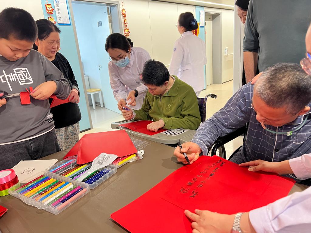 活动中通过组织在院患者和家属书写祝福语,刻画“福”字,把对新春的祝福和对未来的期望融在一撇一捺之间,美好的寓意跃然纸上。同时还有以剪窗花的形式,剪出龙年新气象,一幅幅精美的图案跃然而生。最具创造性的还得是制作龙年福卡,从书写绘画到装饰,患者及家属递上了各式各样的福卡,最后将成果送给每一位患者,让每个人都感受到暖暖的节日氛围,得到精神上的鼓励。