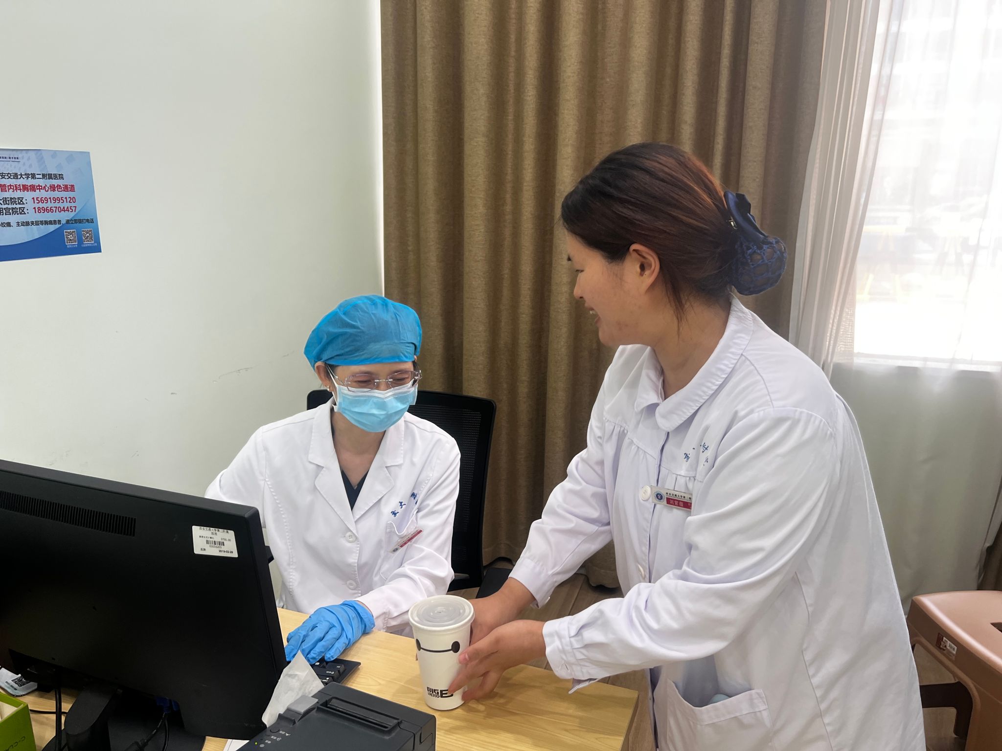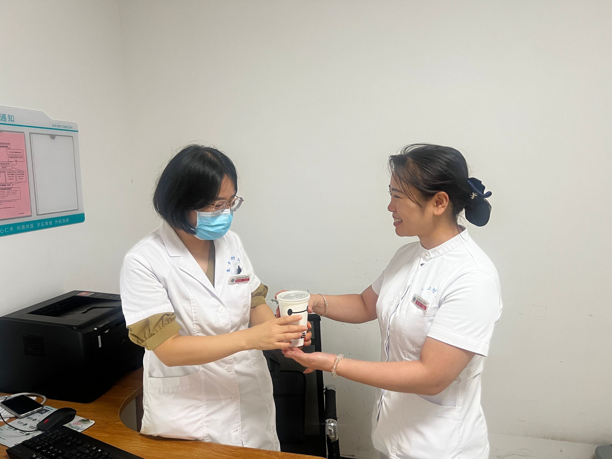 上午,导医们穿梭在各个诊区与窗口之间,遇到问诊间隙或短暂休息的医务人员,便及时递上绿豆汤饮品,轻声道一句 “您辛苦了,喝杯绿豆汤解解暑吧”。简单的话语与清凉的饮品,让忙碌中略显疲惫的医务人员脸上漾起欣慰的笑容。