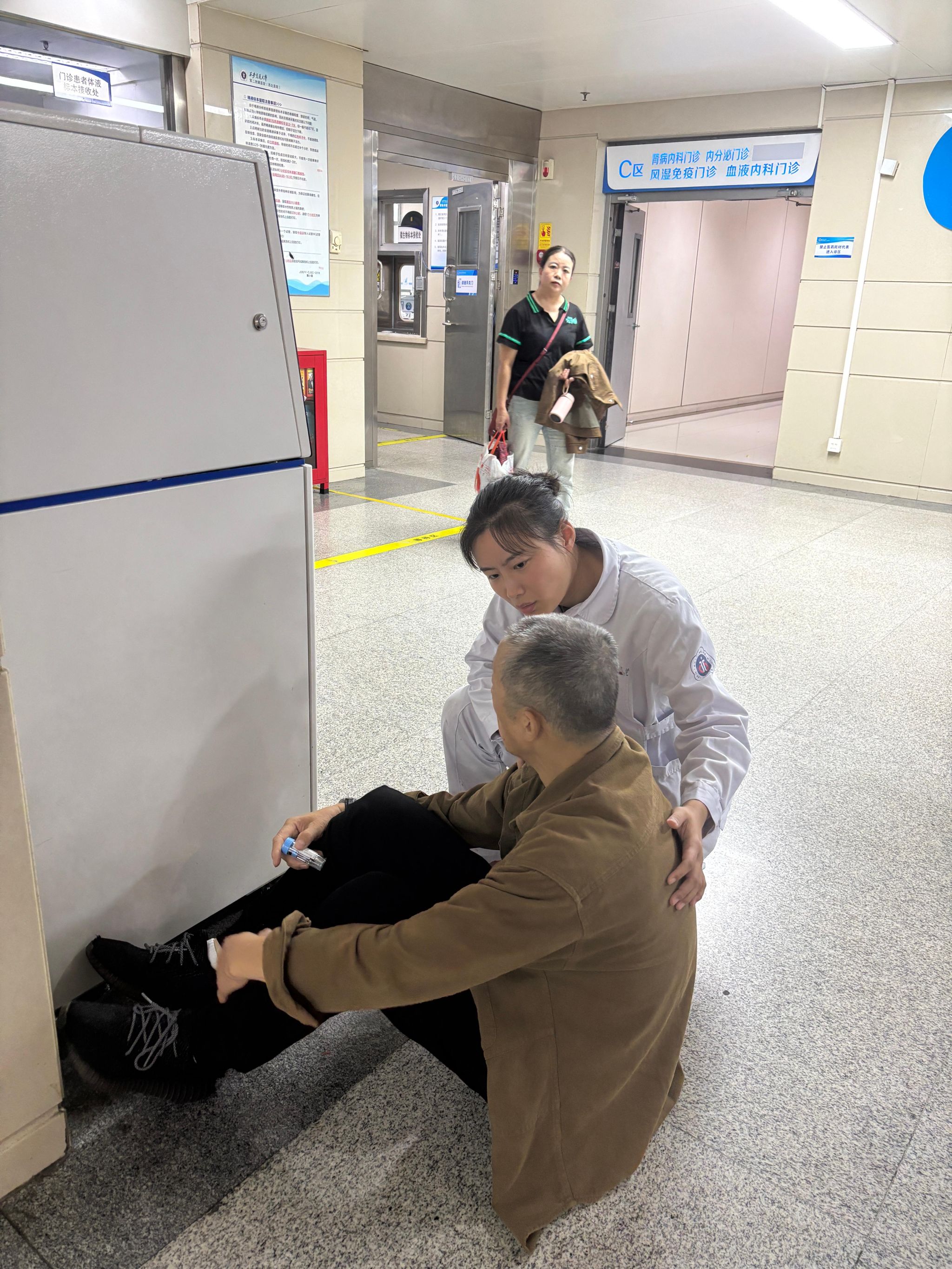 2025年9月11日上午9时许,我院综合楼二楼男卫生间门口发生突发情况:一名老年患者突然晕厥倒地,情况危急。正值巡视的二楼内科分诊台护士第一时间发现异常,迅速上前查看展开了一场紧急救援。