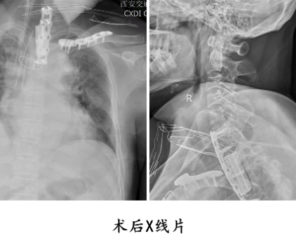 手术当日,麻醉团队蔡英敏教授、杨毅猛主治医师全程保驾护航,手术护理团队郭禹睿、张森渊完美配合,骨科中心王芳老师神经电生理精准监护,骨病与创伤科张纯教授和胸外科刘士源主任主刀、李永伟博士、乔文龙医师配合,采用左侧倒“L”切口,劈开胸骨及锁骨近端 1/3,撑开胸骨,成功突破解剖屏障,清晰暴露胸椎 1-3 椎体前方,精准实施胸椎 1、2 椎体次全切除,彻底解除脊髓压迫,并在骨缺损处植入3D打印融合器、辅以颈胸段前路钢板固定,重建脊柱稳定性。术后骨病与创伤科张格林、吴玮护理团队的精心护理下,患者右上肢及胸廓疼痛完全缓解,上肢肌力逐步恢复,且未出现开胸手术相关并发症,标志着这场多学科联合攻坚取得圆满胜利。
