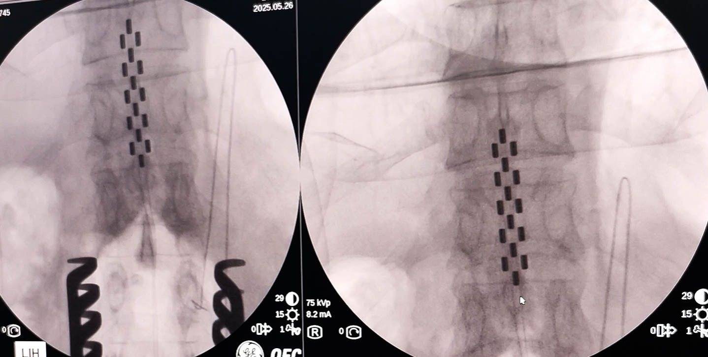 患者王先生(化名),4年前因脑出血导致左侧肢体偏瘫,虽经长期康复治疗,仍存在肢体僵硬、脚趾向下扣等症状,日常生活十分困难。在了解到脊髓电刺激术后,他来到西安交大二附院求诊。经过手术前缜密的评估,神经外科张熙副主任医师团队通过一个小切口,将电极植入到下胸段脊髓硬膜外的位置,术中通过拍X片确定电极位置良好,术中电刺激表明下肢肌肉反应良好。术后,王先生左脚趾内扣感觉消失,下肢较前轻松。待伤口愈合后,可进一步进行康复治疗。