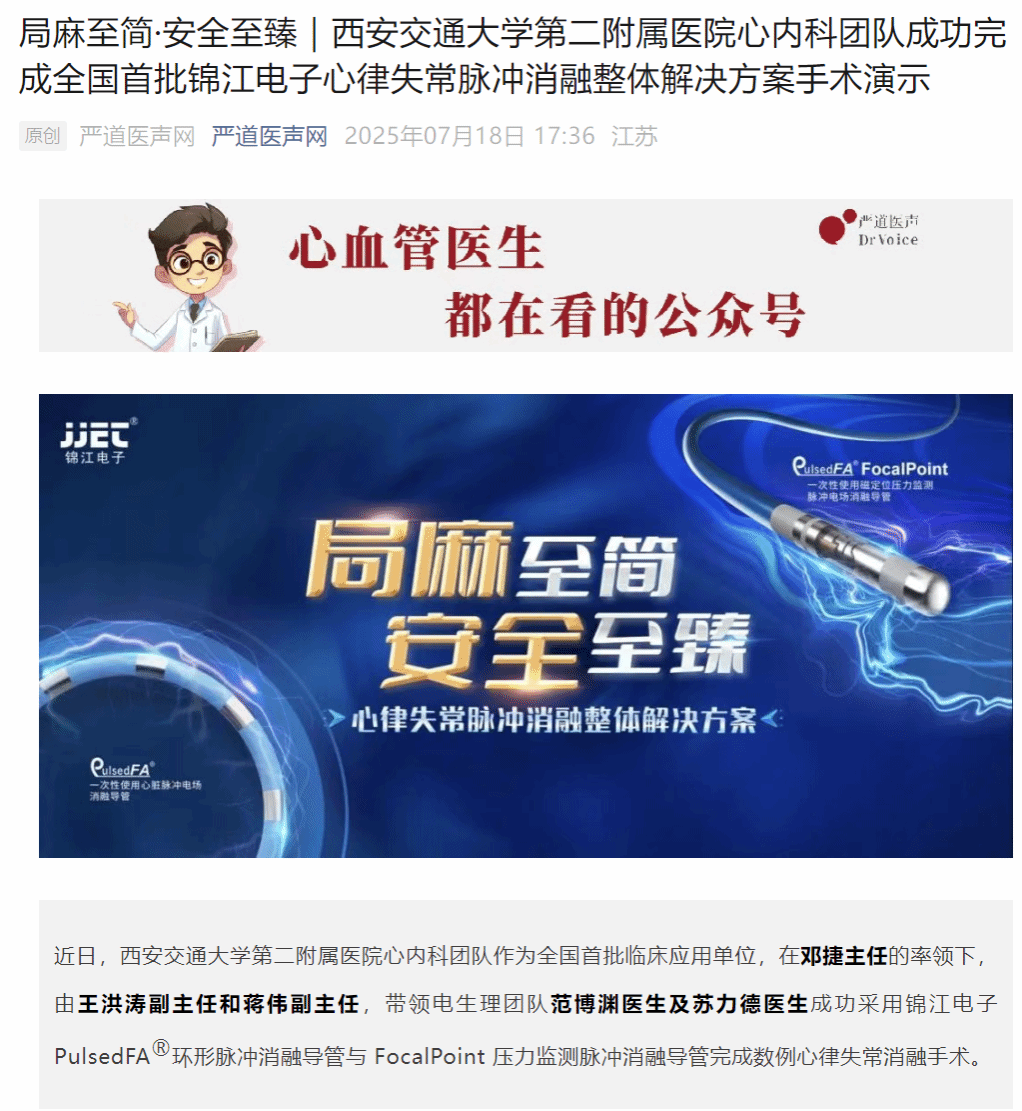近日,西安交通大学第二附属医院心内科心脏电生理团队,采用了全国首批创新脉冲导管消融技术,在最新三维标测系统的支持下完成复杂心律失常脉冲消融手术演示,被国内久负盛名的心血管公众号“严道医声网”报道。