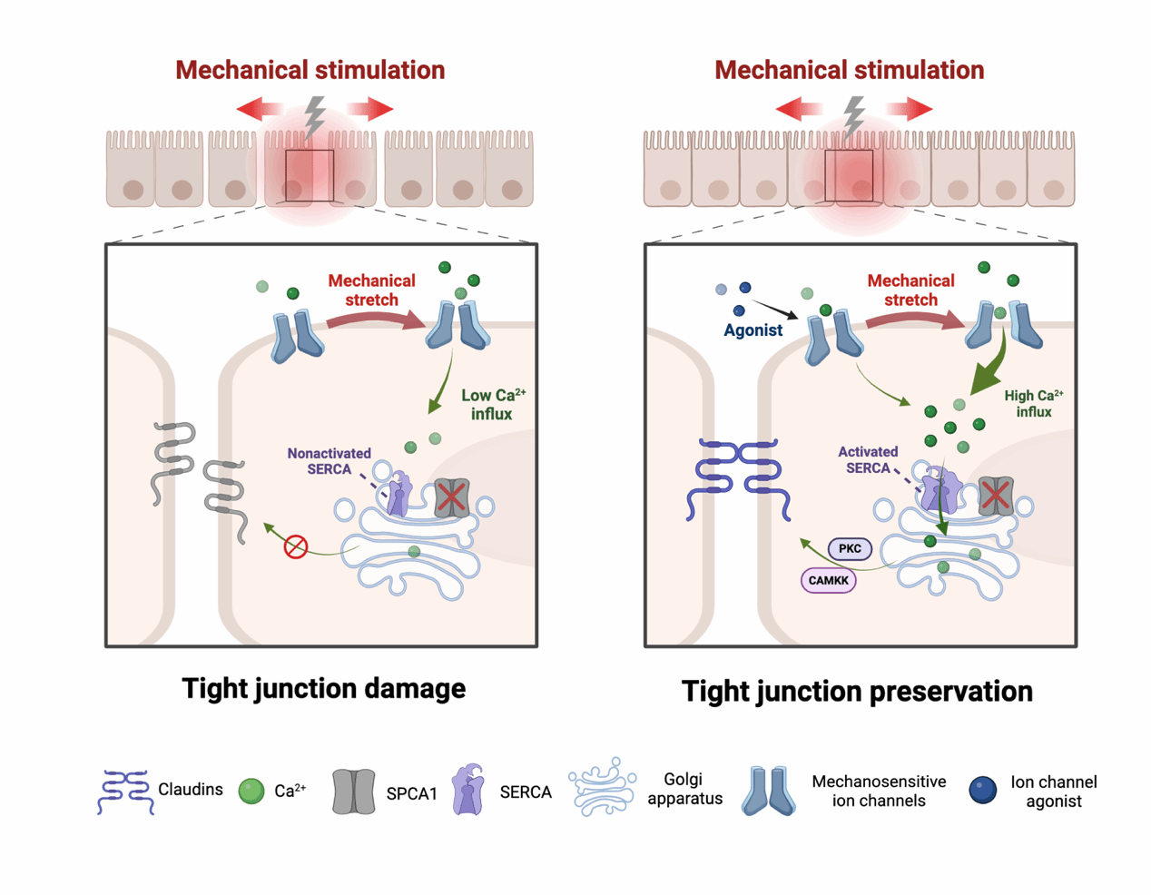 研究团队通过构建ATP2C1敲低的HaCaT细胞模型,并施加循环机械拉伸模拟体内摩擦应激,发现机械应力可导致紧密连接蛋白Claudin1与Claudin4的表达下降和结构破坏。进一步实验表明,高钙环境仅能短暂缓解损伤,而使用PIEZO1特异性激动剂Yoda1或TRPV4激动剂GSK1016790A,则能显著增强机械刺激下的钙内流,并通过SERCA钙泵将钙离子输送至高尔基体,进而经PKC/CaMKK信号通路上调紧密连接蛋白表达,最终维持细胞连接完整性。该保护作用仅见于机械敏感通道激活,非机械敏感通道(如TRPV1、TRPA1)的激动剂则无此效应。