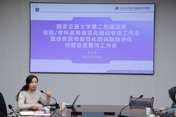 为持续加强住院/专科医师规范化培训(以下简称“住/专培”)工作内涵建设,落实国家住/专培工作整体培训要求,进一步提质增效,同时按照近期陕西省卫健委关于住培基地评估问题自查整改工作的相关要求,西安交通大学第二附属医院住院/专科医师规范化培训专项工作会暨住院医师规范化培训基地评估问题自查整改工作会于12月20日在宗濂会议室召开。副院长种铁、督导组副组长肖延风、督导李丽君、党委办公室、医院办公室、医务部、人力资源部、临床技能示范中心负责人、各专业基地负责人、教学主任、教学秘书以及教务部住培办工作人员参加会议,会议由教务部副主任刘颖主持。