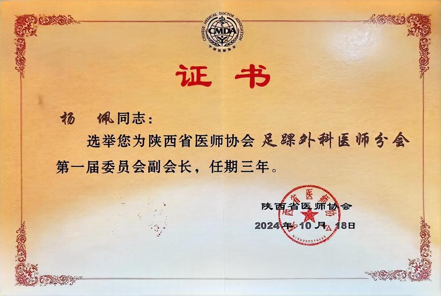 会上,经过严格的选举程序,骨科中心关节与足踝外科杨佩主任凭借其卓越的学术成就、丰富的临床经验以及广泛的影响力,荣幸地当选为陕西省医师协会足踝外科分会副会长。杨佩主任长期以来致力于足踝外科的临床研究与创新,不仅在手术治疗方面有着独到的见解,还在科研与教学领域取得了丰硕的成果。他的当选不仅是对他个人专业能力的肯定,也是对我院关节与足踝外科工作的高度认可。