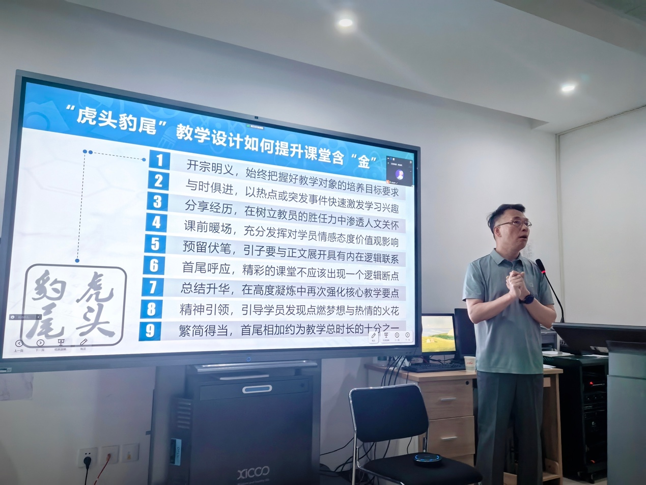赵亚教授首先阐述一堂“金课”要求,要有创新性、高阶性、挑战度,要有故事线及良好的设计思维,随后提出教学设计是课程教学的“灵魂”,介绍了如何通过教学设计提升课堂含金量,包括①开宗明义,始终把握好教学对象的培养目标要求;②与时俱进,以热点或突发事件快速激发学习;③分享经历,在树立教员的胜任力中渗透人文关怀;④课前暖场,充分发挥对学员情感态度价值观影响;⑤预留伏笔,引子要与正文展开具有内在逻辑联系;⑥首尾呼应,精彩的课堂不应该出现一个逻辑断点;⑦总结升华,在高度凝炼中再次强化核心教学要点;⑧精神引领,引导学员发现点燃梦想与热情的火花;⑨繁简得当,首尾相加约为教学总时长的十分之一等。讲座持续1小时余,通过大量吸引人眼球的图片及经验介绍,教导我们如何做好教学设计及提升课堂含金量。