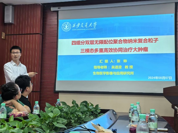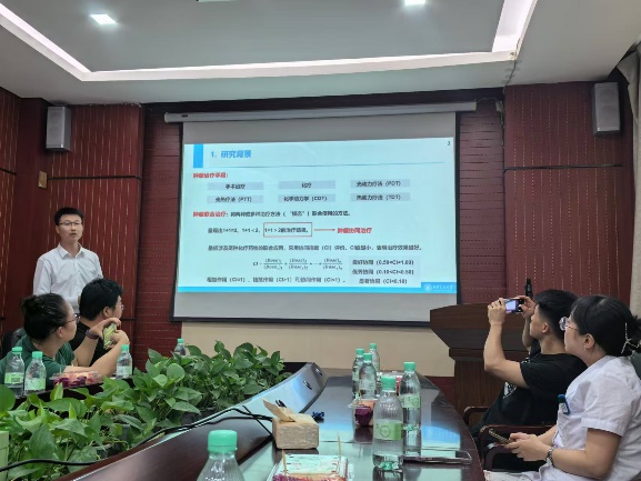 随后吴道澄教授团队的张帅博士带来了团队的最新的前沿研究,对如何进行三模态多重高效协同治疗大肿瘤的具体实验研究和与会人员进行了分享。该研究系统介绍了纳米材料如何进行组分配对、发挥阶段性作用、优化肿瘤治疗流程,实现治愈大肿瘤的目标,达到长时间无复发的目的。吴教授和张帅博士的学术讲座引来了阵阵掌声。